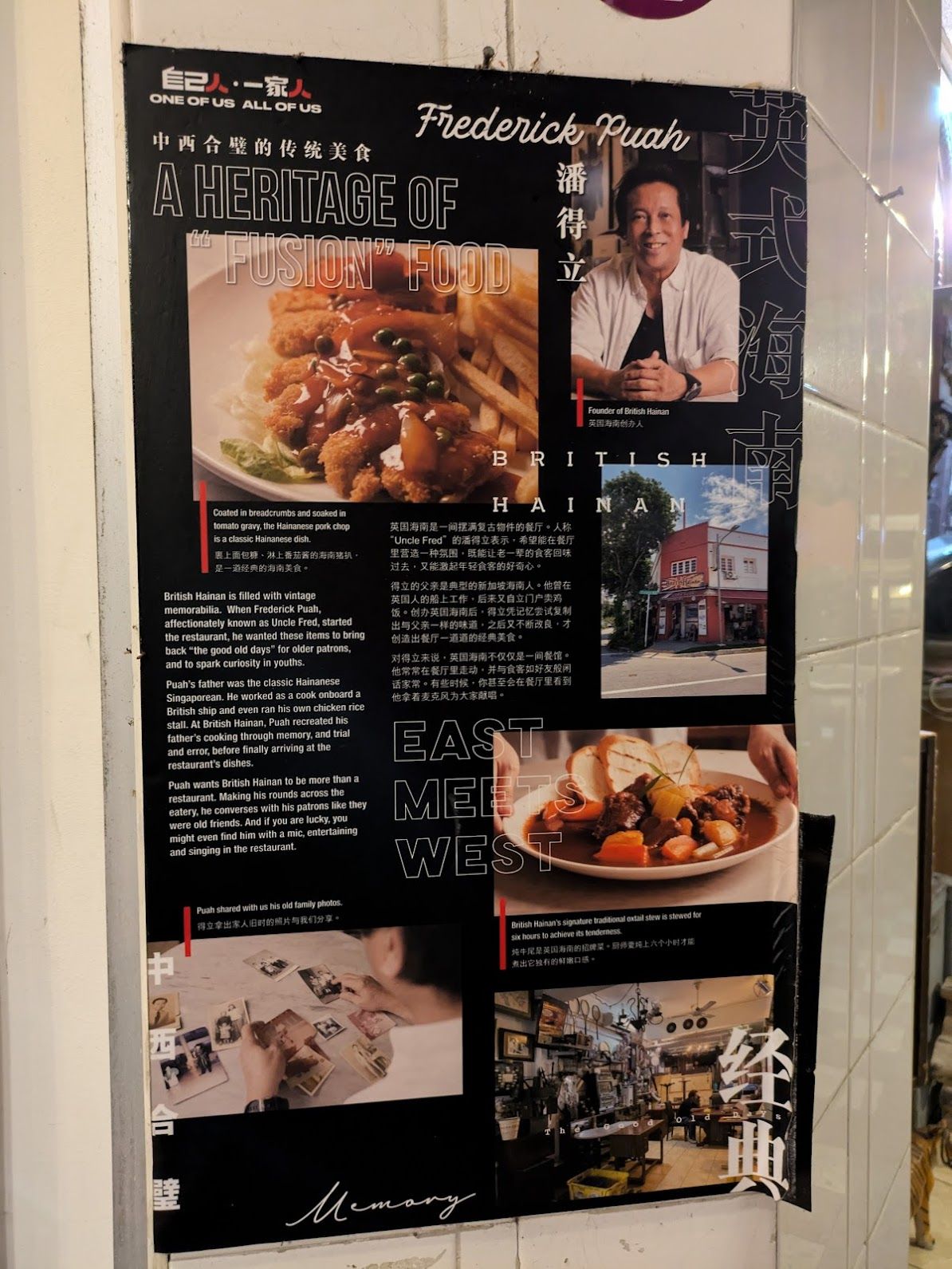 The story of British Hainan is inseparable from its founder, Frederick Puah — affectionately known as Uncle Fred — who opened the restaurant in 2013. Frederick grew up in the servant quarters of a classic black-and-white British colonial house, where his father worked as a personal cook for a British family. The recipes he absorbed as a child — sweet potato-thickened sauces, slow-braised oxtail, breadcrumb-coated pork chops — are the very same ones served at British Hainan today. His father, whose British employer was diabetic, developed sugar-free versions of classic Hainanese Western dishes, replacing starch and sugar with sweet potato puree, a technique that gives the restaurant’s sauces their distinctive, naturally sweet depth. Frederick didn’t just open a restaurant; he built a custodian of a cuisine at serious risk of disappearing.