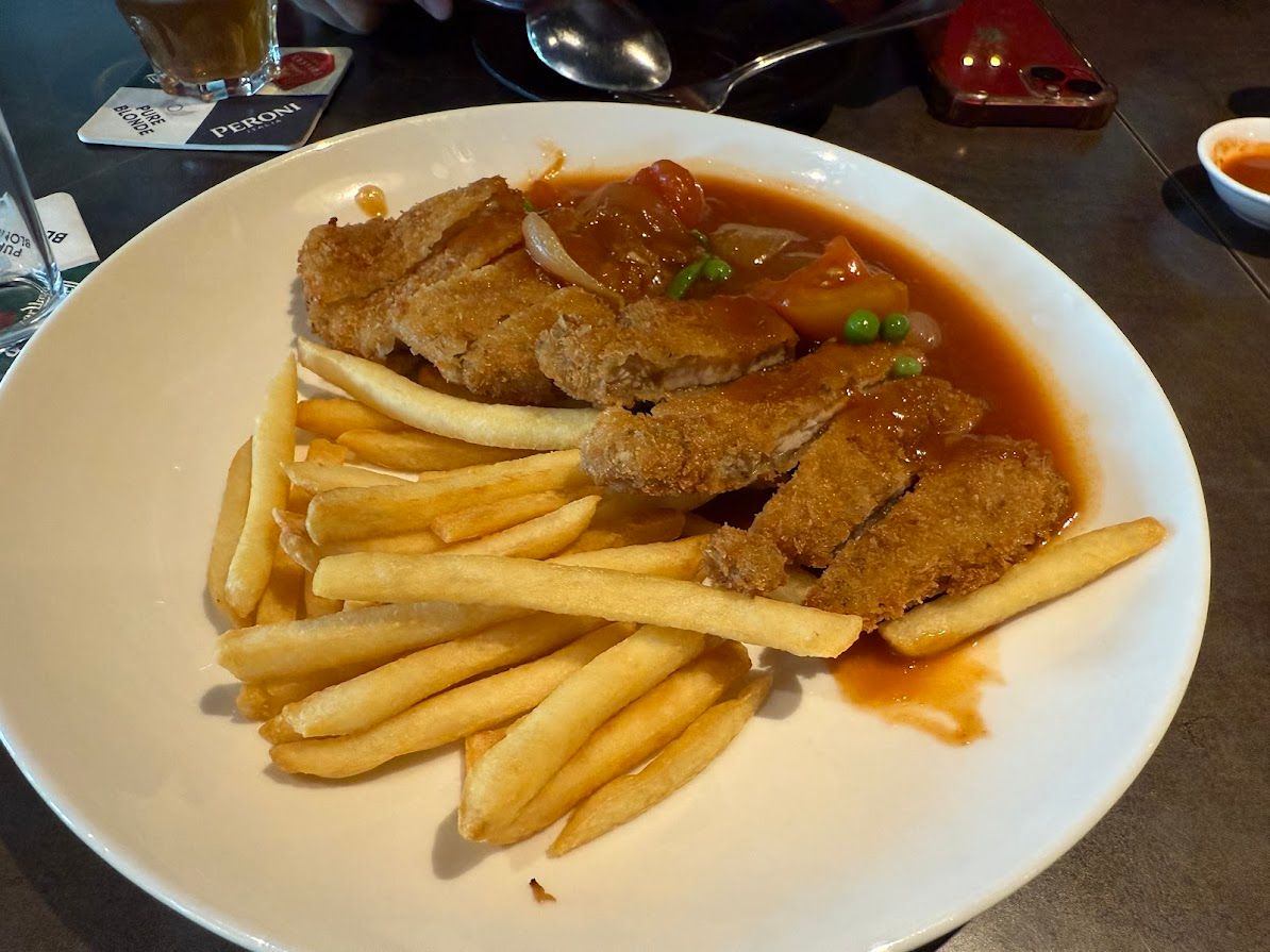 The pork chop is the quintessential Hainanese Western dish, and British Hainan’s version is a masterclass in how tradition should be treated. What makes it unique: the pork is never pounded to tenderise it — Uncle Fred insists on letting the quality of the meat do the work. Instead, each chop is coated in crushed cream crackers (not ordinary breadcrumbs), giving the exterior a distinctive crispness that ordinary fried pork chops simply cannot replicate. It is then deep-fried until golden and served slathered in a rich tomato gravy thickened with sweet potato puree, studded with green peas, onion, tomato, and carrot, and plated with a side of fries and a fresh salad. The pork’s natural sweetness plays beautifully against the gentle tang of the sauce — soggy on purpose, in the best possible way. It’s the kind of dish that makes you realise how much nuance exists in a plate of fried pork.