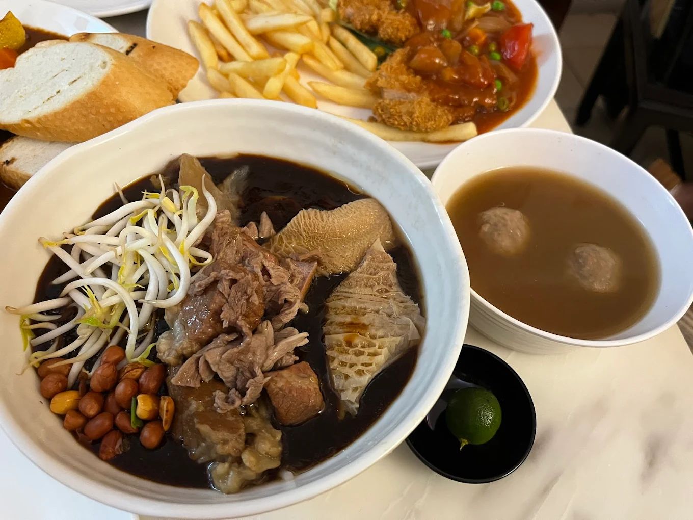 A collaboration with Wah Eng Beef Noodles brought one of the more underrated gems onto the British Hainan menu. The dry version — thick rice noodles smothered in a starch-thickened, sweet potato and soy-based dark sauce — is layered with braised beef slices, tendon, tripe, and beef balls, garnished with preserved vegetables, cincalok (fermented shrimp), and sambal. The beef balls are made to British Hainan’s own specifications, and the result is a bowl that rewards attention: savoury, sweet, tangy, and umami all at once, with slurpy noodles and cuts of beef in three different textures.