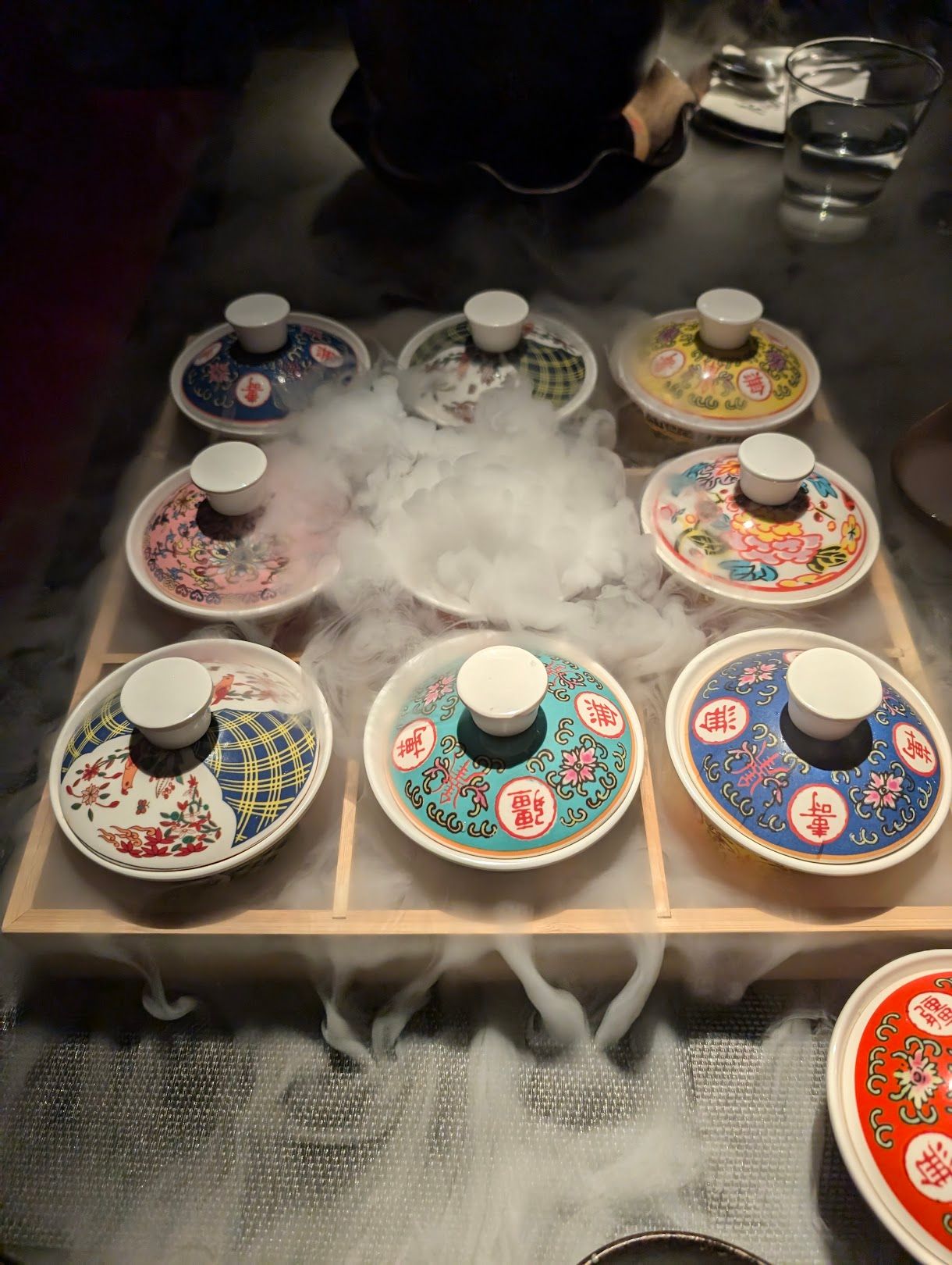 Before the food, there’s the spirit. At Dong Qu, kaoliang isn’t just an ingredient — it’s the backbone of every cocktail on the menu. The sorghum spirit, which clocks in at 58% ABV, is used as the primary mixer across the board, yet the bar team has managed to tame its intensity into something remarkably drinkable. The Cao Cao is the boldest of the lot, its considerable alcohol content somehow balanced into smoothness, while The Rose 痴情玫瑰花 ($28) takes a softer route — Grey Goose, Cointreau, bubble gum, and citrus in an arrangement that is sweeter but still grounded by that signature kaoliang warmth. The real showstopper is 忠孝东路走九遍 (9 East Road), a 3x3 grid of nine cocktail cups served blind — diners have no idea which blend they’ll hit next, making it equal parts drinking game and theatrical performance. Cocktails arrive in porcelain vessels and bronze dragon cups that belong in a museum more than a restaurant, but somehow it all works.
