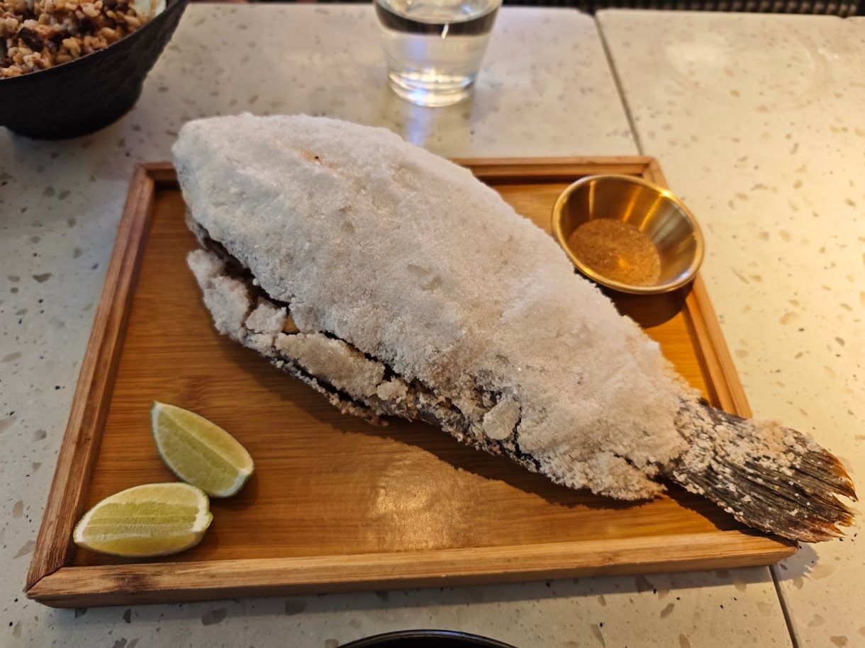 A dish that respects its ingredients. The fish arrives encrusted in salt — a traditional Taiwanese cooking method that seals in moisture while gently seasoning the flesh from the outside in. The result is remarkably moist, finished with garlic and ginger tucked inside the cavity. It’s a dish that rewards patience and punishes rushing.