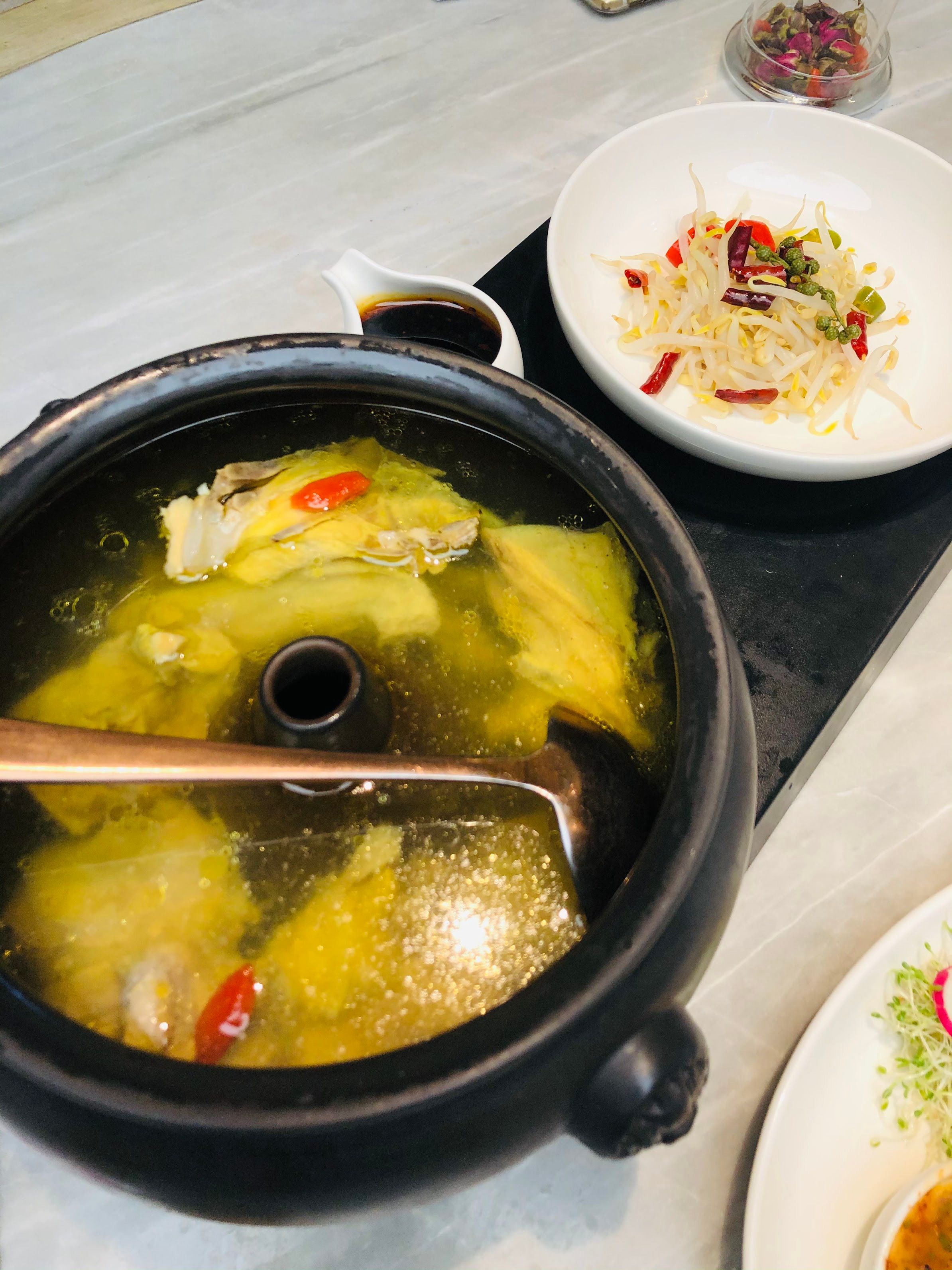 The dish that best captures what Yun Nans is really about. The suancai yu here bears the hallmarks of the Yunnan version of this classic — the broth is built on a stock made from 40 varieties of dried mushrooms, aged over weeks until the umami is impossibly deep and layered. Two types of specially imported pickled vegetables go into the base: Yunnan mustard greens and pickled chillies, fried together with fresh ground chilli to produce a broth that’s tangy and warming without being one-dimensional. The fish itself gets a split treatment — the head is deep-fried to a crisp before service, while the sliced seabass is gently poached to preserve its clean, silky bite. Soft vermicelli and tofu complete the bowl, soaking up every drop of that broth. Only the freshest fish is used, with a limited number of portions served each day — and no fish carried over to the next. Order it early.
